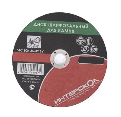 - Диск шлифовальный по камню Интерскол. В виде абразива применяют карбид кремния черный. Не требует принудительного охлаждения водой, т. к. температура круга не больше 70-80°С. Круг самозатачивающийся, но при этом исходный диаметр постепенно уменьшается. Связка бакелитовая, упрочненная. Зернистость средняя, содержание основного размера зерна нормальное. Внешний диаметр 180 мм, внутренний - 22,2 мм.