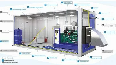 эксплуатация ДГУ в широком диапазоне внешних температур от -40С° до +40С° (от -60С° до +40С° для контейнеров арктического исполнения) за счёт комплекса внутренних систем кондиционирования, вентиляции и обогрева;
