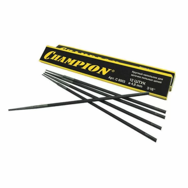 - Напильник Champion 4.8 мм (12 шт) - инструмент, с помощью которого Вы сможете легко и быстро заточить пильные цепи бензопил, а также удалить грязь и опилки из паза направляющей шины.