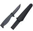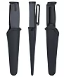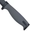 - Этот нож обладает серой мягкой рукоятью, что делает его комфортным и удобным в использовании. Ножны из черного пластика надежно удерживают клинок, обеспечивая безопасное хранение и переноску.