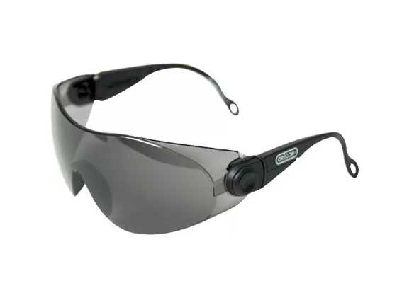 - - Oregon Q515070 - тёмные защитные очки с прозрачной затемненной усиливающей рамкой сверху и черными дужками.