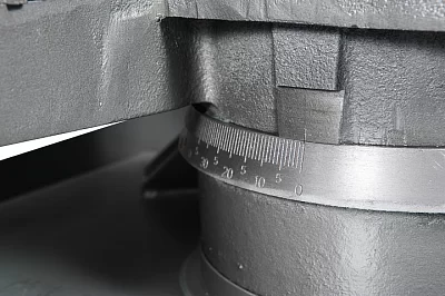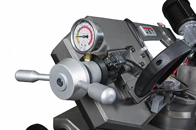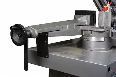 Ленточнопильный станок оборудован быстрозажимными тисками, используя которые можно добиться высокой производительности работ. Консоль станка имеет направляющие, передвижение которых позволяет регулировать проход ленточного полотна, повысить качество распила и ограничить уводку полотна в сторону. Направляющие оснащены подшипниками выполняющими функцию позиционирования ленточного полотна в вертикальном положении относительно обрабатываемой заготовки. Станок имеет тензометр, фиксирующий силу натяжения ленточного полотна. Регулировка силы натяжения осуществляется вручную.