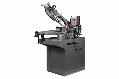 Ленточнопильный станок MBS-910CS представляет собой традиционную модель станков европейского типа, предназначенных для промышленного использования. Станок рассчитан на пиление круглых металлических заготовок под прямым углом максимально допустимого диаметра 225 мм. Особенности конструкции заключаются в возможностях поворота пильной рамы для обработки заготовок под разными углами. Угол поворота пильной рамы вправо составляет 60 0. Максимальный диаметр заготовки для распила под углом 45 0 составляет 160мм, при установке консоли под углом 60 0 – 90 мм. Станок MBS-910CS оборудован системой гидроразгрузки, с помощью которой осуществляется опускание консоли. Поднятие консоли обеспечивается оператором с помощью работы пружины–компенсатора. Наличие гидроцилиндра позволяет регулировать скорость подачи рамы в зону резания.